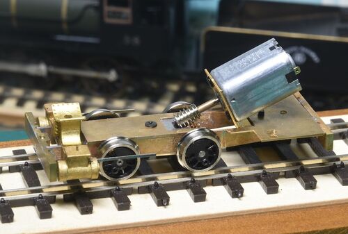フレームのウエイトを接着し、動輪押さえ板をセットして動輪が納まりました。モーターもマウントを作って取り付けます。全くおかしな固定方法ですが、ウォーム1段であればこの方法しかないのです。正解はアイドラーギヤを使ってギヤボックスを作り、モータ…